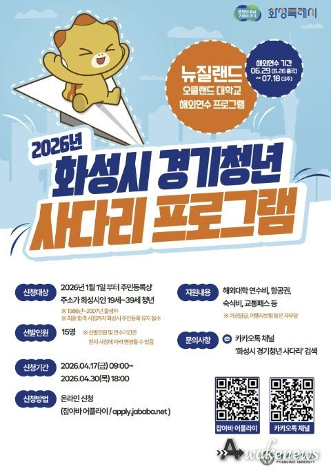 어웨이크뉴스 오경하 기자 | 화성특례시는 해외 연수를 희망하는 청년들에게 경제적 부담 없이 글로벌 경험을 쌓을 수 있는 ‘화성시 경기청년 사다리 프로그램’(운영기관: 평택대학교 산학협력단) 2기 참여자를 모집한다.