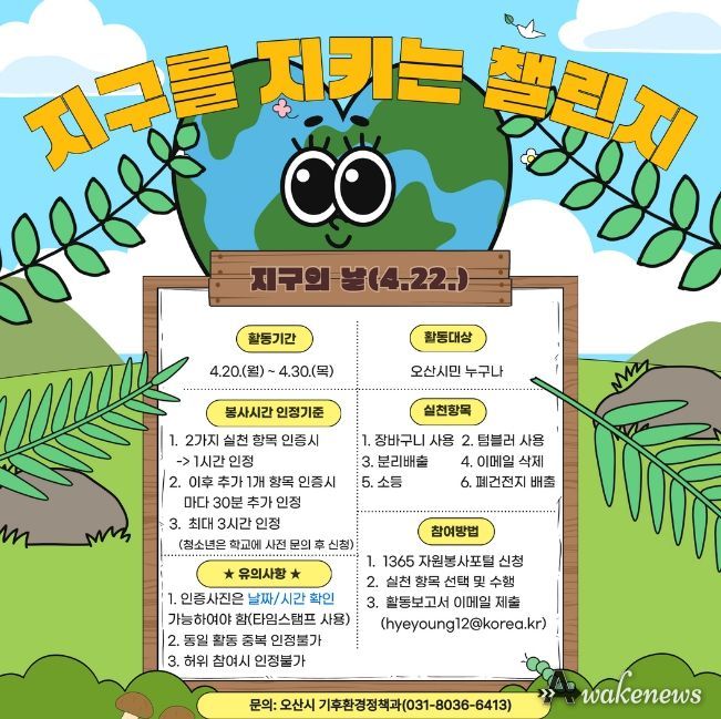 어웨이크뉴스 오경하 기자 | 오산시는 제56주년 ‘지구의 날(4월 22일)’을 맞아 오는 4월 20일부터 24일까지 기후변화주간을 운영하고, 탄소중립 인식 제고와 실천 문화 확산을 위한 시민 참여형 행사를 추진한다고 밝혔다.