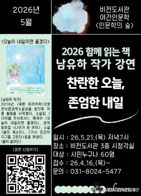 어웨이크뉴스 오경하 기자 | 평택시립 비전도서관은 오는 5월 21일 저녁 7시 남유하 작가를 초청하여 ‘찬란한 오늘, 존엄한 내일’을 주제로 야간 인문학 강연을 진행한다.
