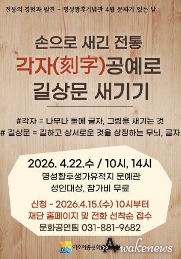 어웨이크뉴스 오경하 기자 | 여주세종문화관광재단은 오는 4월 22일, 명성황후기념관 4월 문화가 있는 날 프로그램으로 '손으로 새긴 전통, 각자(刻字)공예로 길상문 새기기'를 진행한다.