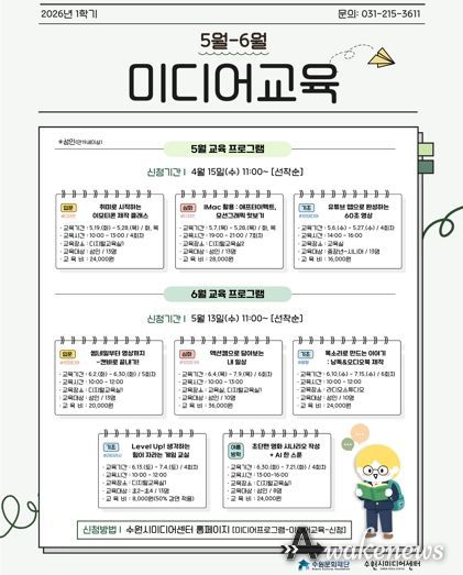 또한, 학기제 교육 프로그램으로는 5월 ▲취미로 시작하는 이모티콘 제작 클래스 ▲IMac 활용 : 애프터이펙트, 모션그래픽 맛보기 등 디자인 중심 교육이 개설되며, 6월에는 ▲썸네일부터 영상까지 캔바로 끝내기! ▲액션캠으로 담아보는 내 일상 등 1인 미디어를 주제로 한 교육을 개설한다. 월별 프로그램 접수일과 프로그램별 수강료가 상이하므로 사전 확인이 필요하다. 미디어 교육 프로그램에 관한 상세 정보 및 교육 신청은 수원시미디어센터 홈페이지를 통해 확인할 수 있다.