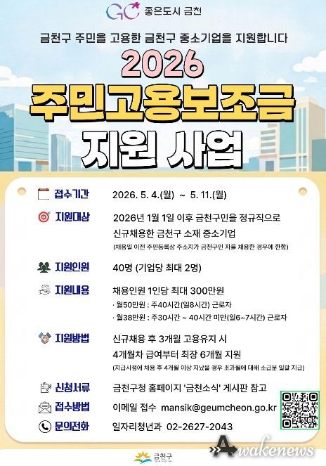 어웨이크뉴스 오경하 기자 | 금천구는 고물가와 경기 침체 등 어려움을 겪는 관내 중소기업을 지원하고, 구민의 취업 기회를 확대하기 위해 ‘2026년 구민고용보조금 지원사업’을 추진한다고 밝혔다.