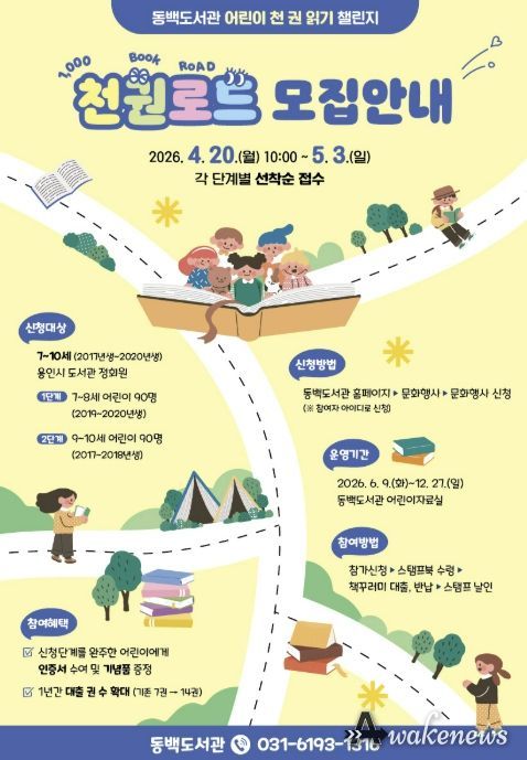 어웨이크뉴스 오경하 기자 | 용인특례시 동백도서관은 어린이 천 권 읽기 챌린지 ‘천권로드(ROAD)’ 참여자를 모집한다고 20일 밝혔다.