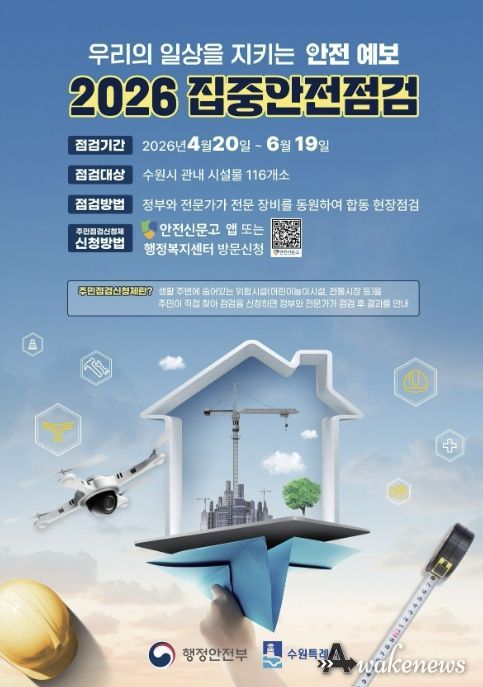 어웨이크뉴스 오경하 기자 | 수원특례시가 안전사고를 예방하고, 시민의 안전 의식을 고취하기 위해 20일부터 6월 19일까지 ‘2026년 집중안전점검’을 한다.