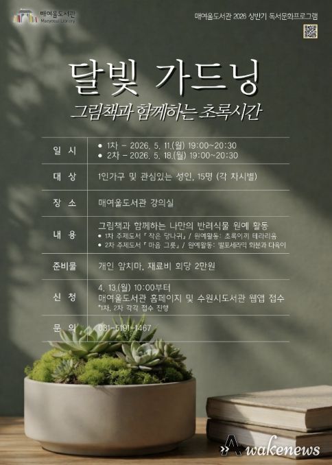 어웨이크뉴스 오경하 기자 | 수원시 매여울도서관이 그림책 읽기와 식물 가드닝을 결합한 체험형 프로그램 ‘달빛 가드닝, 그림책과 함께하는 초록시간’을 운영한다.