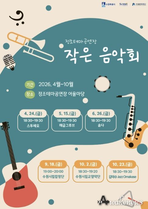 수원문화재단은 오는 24일부터 10월 23일까지 정조테마공연장 어울마당에서 시민 누구나 즐길 수 있는 야외 공연 시리즈 ‘작은 음악회’를 운영한다.
