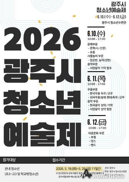 어웨이크뉴스 오경하 기자 | 광주시는 ‘2026년 광주시 청소년예술제’ 참가자를 모집한다고 20일 밝혔다.