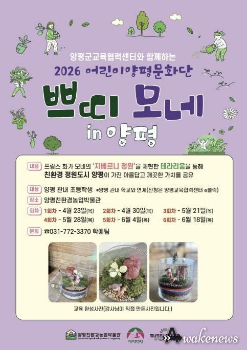 어웨이크뉴스 오경하 기자 | 양평친환경농업박물관은 오는 4월부터 6월까지 양평 관내 초등학생을 대상으로 2026년 교육 프로그램 ‘어린이 양평문화단, 쁘띠 모네 in 양평’을 운영한다고 밝혔다.