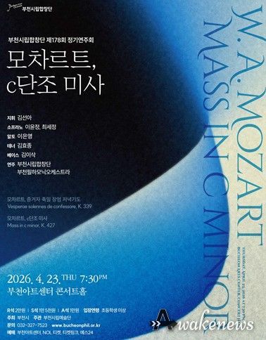 어웨이크뉴스 오경하 기자 | 부천시립합창단이 오는 4월 23일 오후 7시 30분 부천아트센터 콘서트홀에서 제178회 정기연주회 ‘모차르트, c단조 미사’를 개최한다. 이번 공연은 김선아 상임지휘자의 지휘 아래 소프라노 이윤정, 최세정, 알토 이은영, 테너 김효종, 베이스 김이삭이 협연자로 무대에 오르며, 부천시립합창단과 부천필하모닉오케스트라, 구민아(오르간)가 함께한다.
