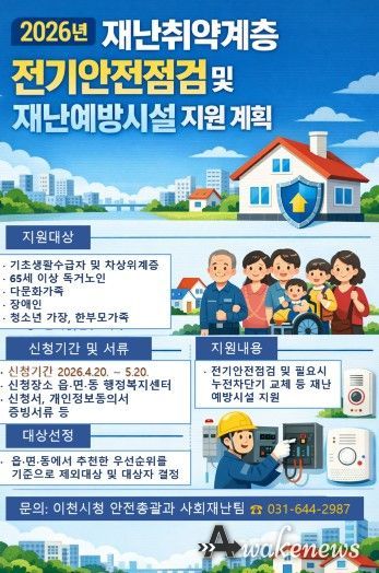 어웨이크뉴스 오경하 기자 | 이천시는 전기설비 노후화 등으로 인한 화재와 안전사고를 예방하고 재난취약계층의 주거 안전을 강화하기 위해 ‘재난취약계층 전기안전점검 및 재난예방시설 지원사업’을 추진한다고 밝혔다.