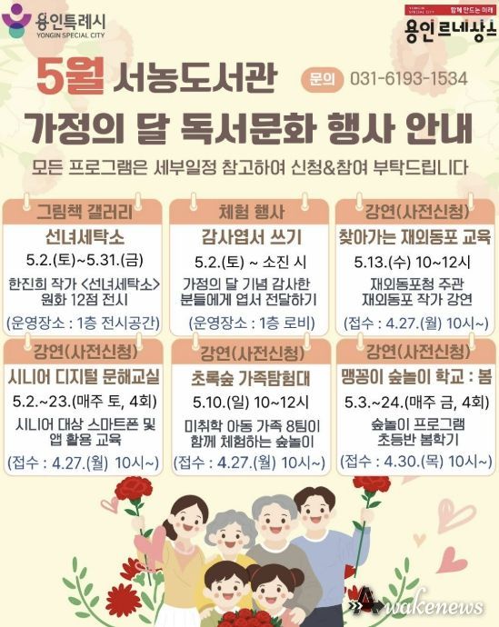 어웨이크뉴스 오경하 기자 | 용인특례시 서농도서관은 오는 5월 가정의 달을 맞아 다양한 세대를 아우르는 프로그램으로 이뤄진 ‘2026년 5월 독서문화행사’를 마련했다고 21일 밝혔다.