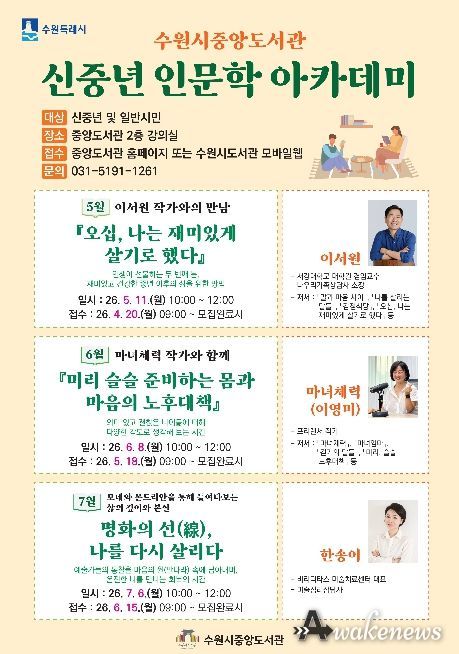 어웨이크뉴스 오경하 기자 | 수원시 중앙도서관이 5월부터 7월까지 매달 1회 운영하는 ‘신중년 인문학 아카데미’ 수강생을 모집한다.
