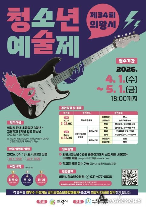 어웨이크뉴스 오경하 기자 | 의왕시청소년재단 산하 의왕시청소년수련관은 지역 청소년의 예술적 재능과 끼 발산의 장인 ‘제34회 의왕시청소년예술제’의 참가자를 5월 1일까지 모집한다고 밝혔다.