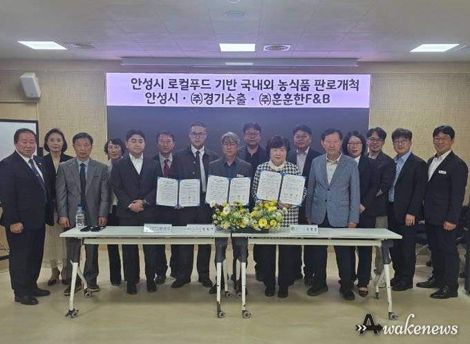 어웨이크뉴스 오경하 기자 | 안성시 농업기술센터는 지난 4월 17일, 안성시 농특산물 및 농식품의 국내외 판로 확대를 위해 ㈜경기수출, ㈜훈훈한F&B와 전략적 업무협약(MOU)을 체결했다고 밝혔다.