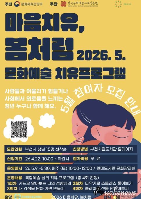 어웨이크뉴스 오경하 기자 | 부천시립원미도서관 청년공간 ‘원미청정구역’이 문화체육관광부 주최하고 한국문화예술교육진흥원이 주관하는 ‘2026 마음치유, 봄처럼’ 사업 협력기관으로 선정돼 청년 대상 문화예술 치유 프로그램을 운영한다고 21일 밝혔다.
