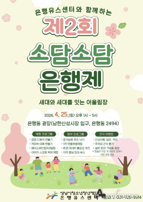 어웨이크뉴스 오경하 기자 | 성남시청소년청년재단 은행유스센터는 오는 4월 25일 오후 1시부터 5시까지 은행동 광장에서 청소년과 지역 주민이 함께하는 ‘제2회 소담소담 은행제’를 개최한다.