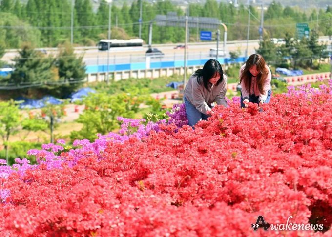 어웨이크뉴스 오경하 기자 | 하남시 미사한강공원 2호 전망대 일대가 12만 본의 선홍빛 철쭉으로 물들어 장관을 연출하고 있다. 강바람을 따라 일렁이는 붉은 꽃물결이 시민들의 발길을 붙잡으며 도심 속 새로운 '봄의 성지'로 떠올랐다.