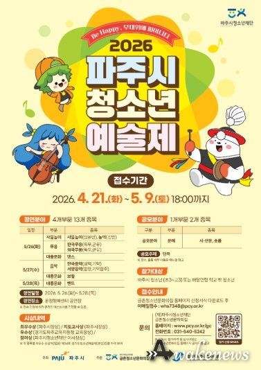 어웨이크뉴스 오경하 기자 | (재)파주시청소년재단 금촌청소년문화의집은 오는 4월 21일부터 5월 9일까지 ‘2026 파주시청소년예술제’ 참가자를 모집한다고 밝혔다. 올해‘Be Happy, 무대위에 피어나다’를 부제로 개최되는 이번 예술제는 제34회 경기도청소년예술제 파주시 공식 예선으로, 파주시 청소년이라면 누구나 참가 신청이 가능하다.