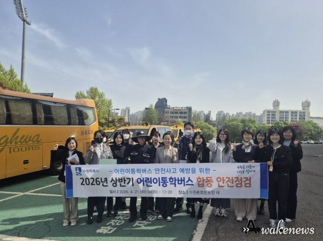어웨이크뉴스 오경하 기자 | 수원특례시는 21일 수원종합운동장 주차구역에서 수원 장안·권선·팔달·영통경찰서, 한국교통안전공단과 함께 ‘2026년 상반기 어린이통학버스 합동 안전점검’을 했다.