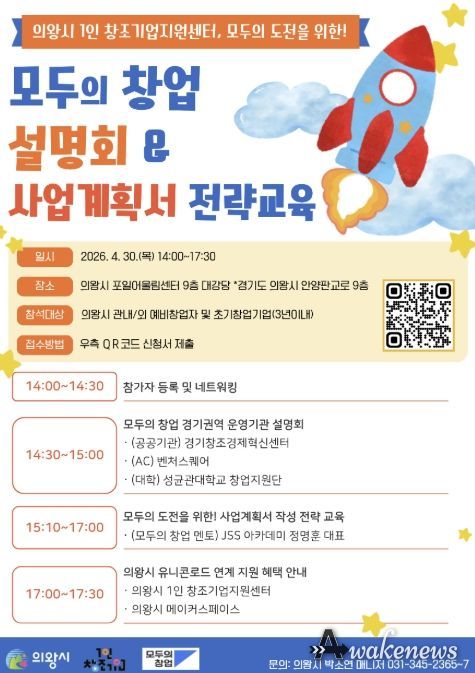 어웨이크뉴스 오경하 기자 | 의왕시 1인 창조기업지원센터는 4월 30일, 창업을 희망하는 예비 및 초기 창업자를 대상으로 ‘모두의 창업’ 설명회 및 전략 교육을 개최한다.