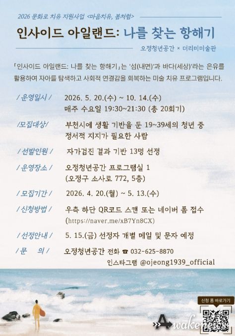 어웨이크뉴스 오경하 기자 | 부천시는 오정청년공간에서 정서적 고립감을 겪는 청년을 위한 미술 치유 프로그램 ‘인사이드 아일랜드: 나를 찾는 항해기’ 참여자를 5월 13일까지 모집한다.