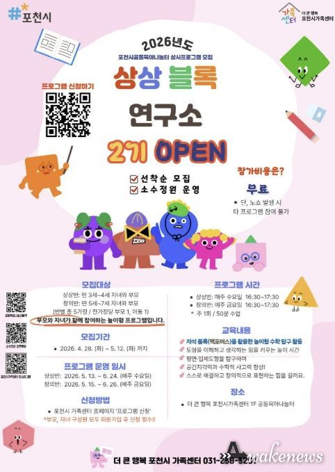 어웨이크뉴스 오경하 기자 | 포천시 직영 더 큰 행복 포천시가족센터가 공동육아나눔터 상시 프로그램 ‘상상블록연구소’ 2기 참여자 모집을 진행한다.