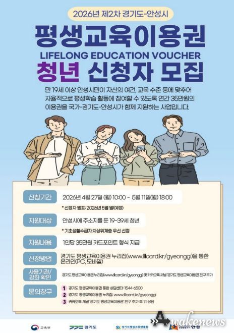 어웨이크뉴스 오경하 기자 | 안성시는 시민의 평생학습 참여 기회를 두텁게 보장하기 위해 오는 4월 27일 오전 10시부터 5월 11일 오후 6시까지 ‘2026년 제2차 경기도-안성시 평생교육이용권’ 지원 대상자를 모집한다고 밝혔다.