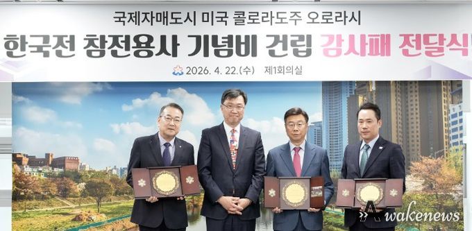 어웨이크뉴스 오경하 기자 | 성남시가 22일 오후 2시 미국 콜로라도주 오로라시의 ‘한국전 참전용사 기념비’ 건립에 기여한 공로를 인정받아 오로라시 한국전참전용사기념비건립위원회로부터 감사패를 받았다.