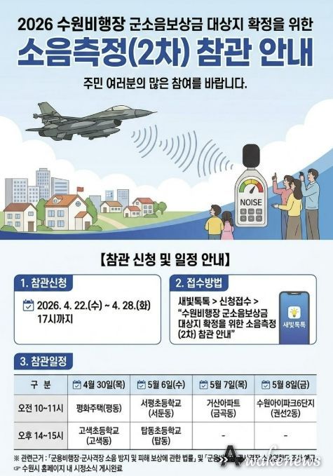 어웨이크뉴스 오경하 기자 | 수원특례시가 수원비행장 인근 주민들의 소음 피해 보상 근거가 될 국방부의 ‘수원비행장 소음 영향도 조사 2차 소음측정’ 주민 참관 참여자를 모집한다. 4월 28일까지 새빛톡톡으로 신청할 수 있다.