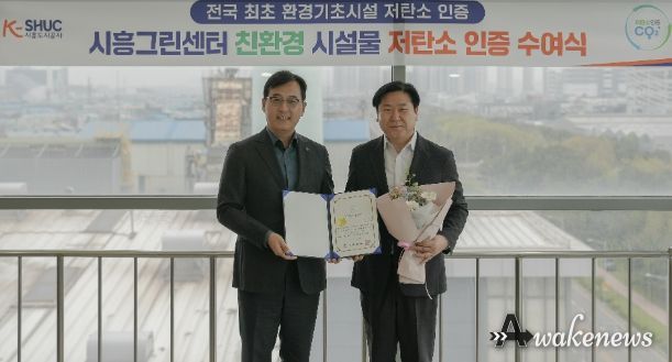 어웨이크뉴스 오경하 기자 | 시흥도시공사는 지난 4월 21일 도시재생안전협회로부터 시흥그린센터 ‘친환경 시설물 저탄소’ 인증을 획득하고 인증식을 진행했다고 밝혔다. 이번 성과는 기관 단위가 아닌, 전국 환경기초시설 중 최초로 ‘시설물 단위 사업장’의 저탄소 인증을 받은 사례로, 환경 분야의 새로운 이정표를 세웠다는 평가를 받고 있다.