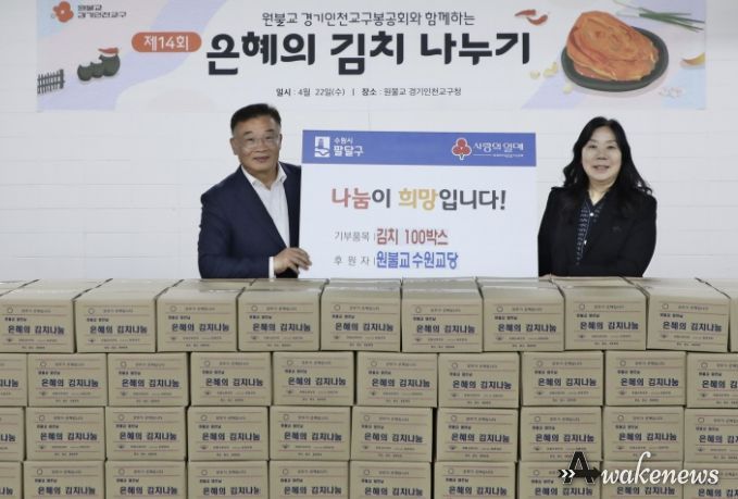 어웨이크뉴스 오경하 기자 | 수원시 팔달구은 원불교 수원교당으로부터 지난 22일, 김치 100박스를 기부받았다고 밝혔다.