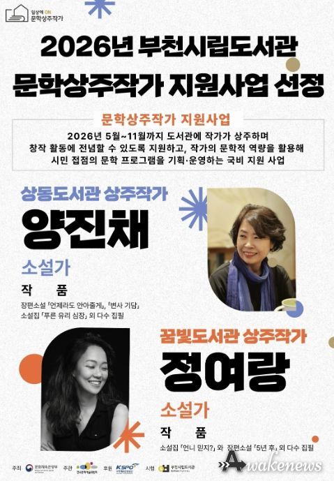 어웨이크뉴스 오경하 기자 | 부천시립상동도서관과 꿈빛도서관은 문화체육관광부가 주관하고 한국문화예술위원회가 주최하는 ‘2026년 도서관 상주작가 지원사업’ 공모에 선정돼 5월부터 시민 대상 문학 프로그램을 운영한다.