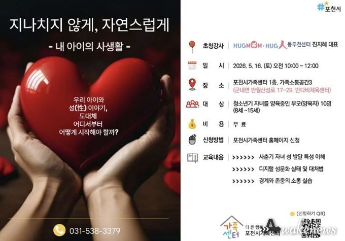 어웨이크뉴스 오경하 기자 | 포천시 직영 더 큰 행복 포천시가족센터는 오는 21일부터 사춘기 자녀를 둔 양육자를 대상으로 부모 교육 프로그램 ‘지나치지 않게, 자연스럽게’의 참여자를 모집한다. 이번 교육은 5월 16일 오전, 포천시가족센터 가족소통공간(반다비체육센터 1층)에서 대면 강의로 진행된다.