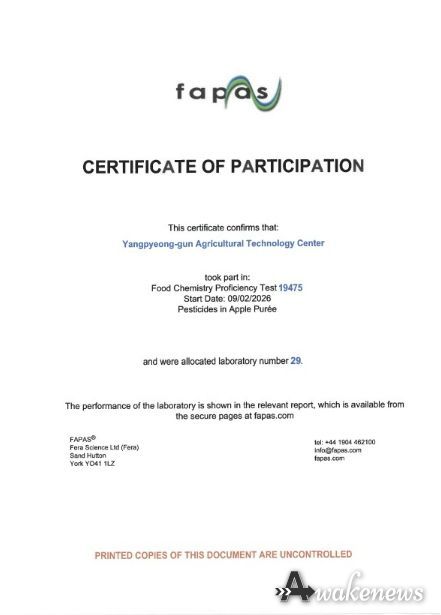 어웨이크뉴스 오경하 기자 | 양평군은 영국 식품환경연구청(FERA)이 주관한 ‘2026년 잔류농약 국제비교숙련도 평가’에서 최고 수준의 분석능력을 인정받아 3년 연속 우수성을 입증했다고 21일 밝혔다.