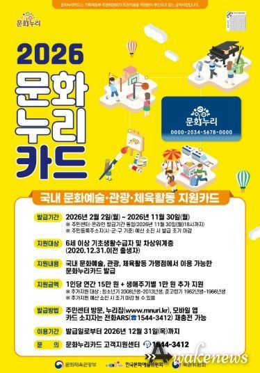 한편, 문화누리카드는 각 동 행정복지센터, 문화누리카드 누리집, 모바일 앱 등을 통해 오는 11월 30일까지 선착순 발급되며, 12월 31일까지 사용하지 않으면 자동 소멸한다.