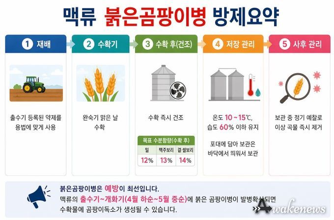 어웨이크뉴스 오경하 기자 | 이천시는 맥류의 본격적인 출수기(40%출수) ~ 개화기(출수 후 5~10일)를 맞아 붉은곰팡이병 방제를 당부한다고 전했다. 최근 봄철의 기온상승과 강우량의 상황에 따라서 맥류의 붉은곰팡이병 방제 중요성을 강조했다.