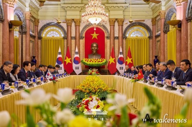 어웨이크뉴스 오경하 기자 | 베트남을 국빈 방문 중인 이재명 대통령은 22일(현지시간) 오후 베트남 국가주석궁에서 또 럼 당서기장 겸 국가주석과 정상회담을 갖고, 양국 간 포괄적 전략 동반자 관계 발전 방안과 지역·국제 정세 등에 대해 심도 있게 논의했다고 이규연 청와대 홍보소통수석이 서면 브리핑했다.