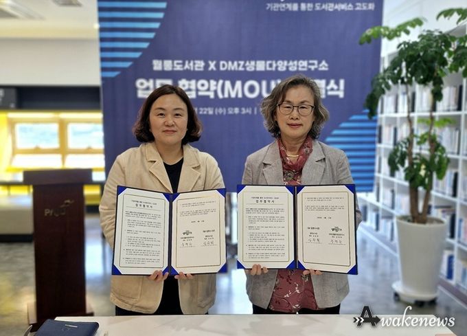 어웨이크뉴스 오경하 기자 | 파주시 월롱도서관은 지난 22일 디엠지(DMZ)생물다양성연구소와 지역사회 독서진흥 및 생태환경 분야 협력을 위한 업무협약을 체결했다.