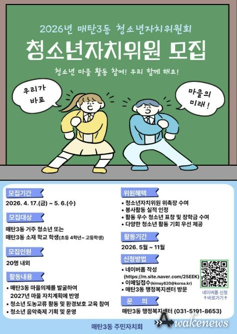 어웨이크뉴스 오경하 기자 | 수원시 영통구 매탄3동은 매탄3동 주민자치회가 지역 청소년의 참여를 확대하고, 향후 지역사회를 이끌어 나갈 역량을 기르기 위해 2026년 청소년자치위원회 위원을 모집한다고 밝혔다.