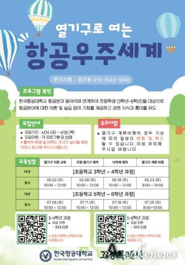 프로그램은 △열기구로 여는 항공우주의 세계 △패러글라이딩으로 여는 하늘 △천체관측 우주탐험 등 총 3개 과정으로, 초등학교 저학년(3~4학년)과 고학년(5~6학년)으로 나눠 운영된다. 각 과정은 한국항공대에서 주 1회씩 4주간 진행된다.