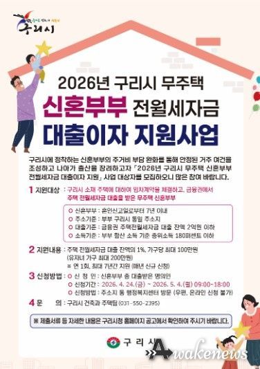 어웨이크뉴스 오경하 기자 | 구리시는 관내 무주택 신혼부부의 주거비 부담을 완화하고 저출생 문제 극복에 이바지하기 위해 ‘2026년 2차 무주택 신혼부부 전월세 자금 대출이자 지원사업’을 오는 4월 24일부터 시행한다고 밝혔다.