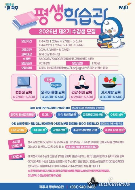 어웨이크뉴스 오경하 기자 | 파주시 평생학습관은 시민의 평생학습 기회를 확대하기 위해 '2026년 제2기 정규강좌’수강생을 오는 4월 27일부터 5월 6일까지 모집한다.