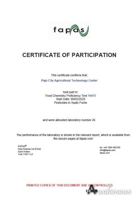 어웨이크뉴스 오경하 기자 | 파주시 농산물 안전분석실이 국제적으로 공신력 있는 잔류농약 분석 능력 평가에서 4년 연속 우수한 결과를 달성하며 세계 수준의 분석 역량을 입증했다.