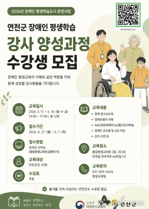 어웨이크뉴스 오경하 기자 | 연천군은 교육부 국립특수교육원이 주관하는 '2026년 장애인 평생학습도시 운영 지원사업' 공모에 선정됨에 따라 장애인 평생교육 현장형 강사 양성 과정을 운영한다.