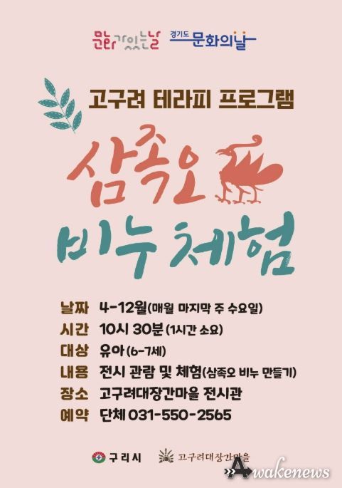 어웨이크뉴스 오경하 기자 | 구리시는 4월부터 고구려대장간마을에서 매월 마지막 주 수요일 ‘문화가 있는 날’을 맞아 ‘삼족오 비누 체험! 고구려 치료 프로그램’을 운영한다고 밝혔다.