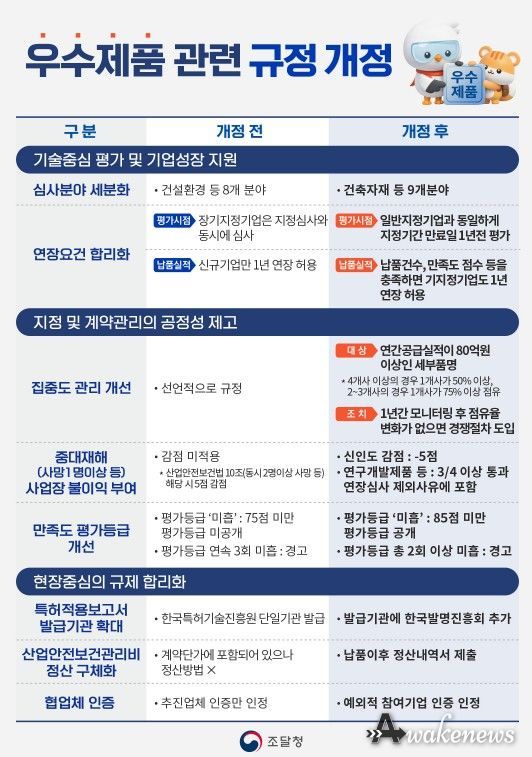 어웨이크뉴스 오경하 기자 | 조달청은 기업의 성장을 지원하고, 공정한 경쟁환경을 조성하기 위해 우수조달물품 관련 규정을 개정하여 4월 27일부터 시행한다고 밝혔다.