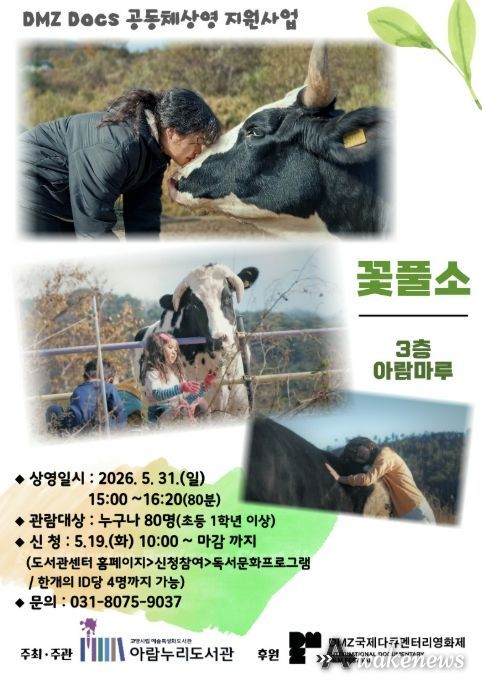 어웨이크뉴스 오경하 기자 | 고양특례시 아람누리도서관은 DMZ국제다큐멘터리영화제와 협업해 오는 5월 31일 오후 3시, 도서관 3층 아람마루에서 다큐멘터리 영화 ‘꽃풀소’ 상영회를 개최한다.