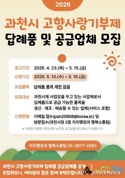 어웨이크뉴스 오경하 기자 | 과천시는 고향사랑기부제 활성화를 위해 답례품 공급업체를 공개 모집한다고 밝혔다.