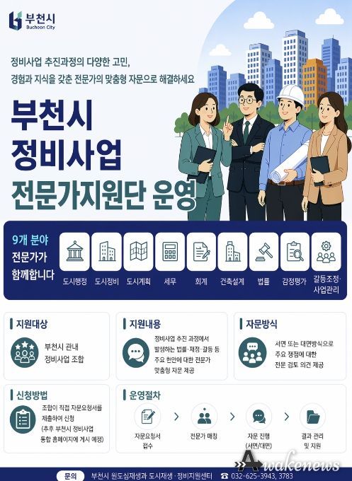어웨이크뉴스 오경하 기자 | 부천시는 정비사업 추진 과정에서 발생하는 법률·재정·갈등 등 주요 현안에 대한 전문 자문을 지원하기 위해 ‘정비사업 전문가지원단’을 구성해 운영한다고 지난 28일 밝혔다.
