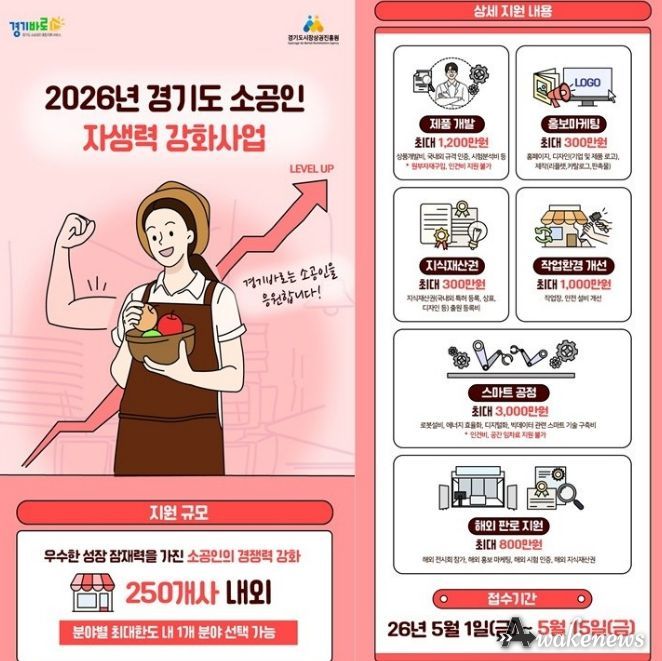 참여를 희망하는 소공인은 오는 5월 1일부터 5월 15일 오후 6시까지 ‘경기바로’누리집을 통해 온라인으로 신청하면 된다. 심사는 정량·정성 평가를 거쳐 60점 이상 고득점순으로 선정될 예정이며, 선정 결과는 6월 중 개별 통보된다.